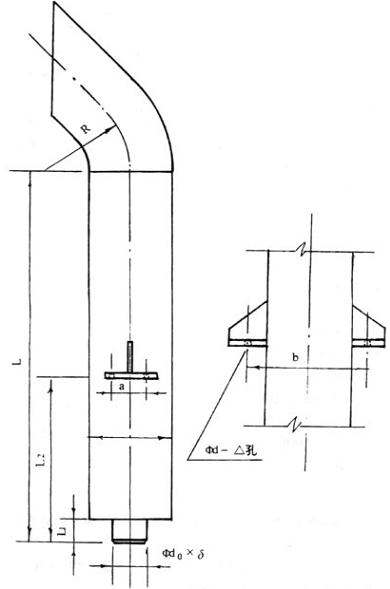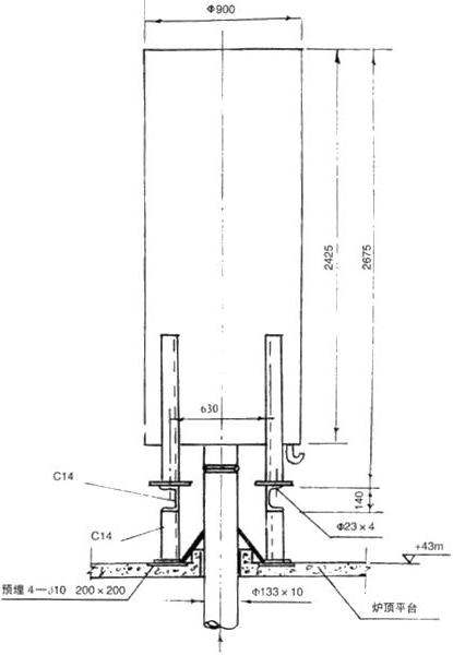 ⑥對(duì)用于除氧器、射汽抽氣器排汽等小排量的消聲器,外型設(shè)計(jì)成管式,安裝較為方便。安裝方式如圖4所示,消聲器垂直的沿主廠房墻、柱安裝。在墻、柱上設(shè)置型鋼滑動(dòng)支架,將消聲器及管道架設(shè)其上,消聲器排放口應(yīng)對(duì)著屋頂方向。應(yīng)注意,該消聲器出廠時(shí)已制有固定支座,當(dāng)采用滑動(dòng)支架式安裝時(shí),固定支座可以不用。如圖4。
